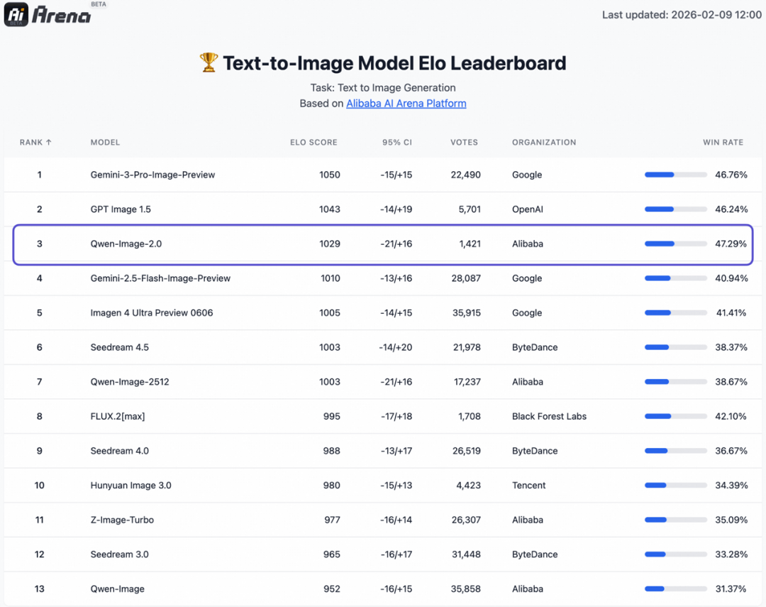 千问发布最新图像模型 Qwen-Image-2.0,超长文字渲染,摄影级线 日,阿里巴巴正式发布新一代图像生成及编辑模型 Qwen-Image-2.0。作为千问大模型的图像生成模型底座,Qwen-Image-2.0 集生图和编辑于一体,在 AI Arena 文生图评测中斩获 1029 分,超过 Seedream4.5、Flux2-Max 等模型,仅次于谷歌 Nano Banana Pro 和 GPT Image1.5。Qwen-Image-2.0 支持 1K token 的超长文字输入和 2K 高分辨率,可准确渲染复杂指令,轻松生成专业的 PPT 及信息图,质感媲美专业级摄影师;同时,千问新模型拥有极强中文汉字渲染能力,数百字的古文全文几乎都能完全渲染在图片中。