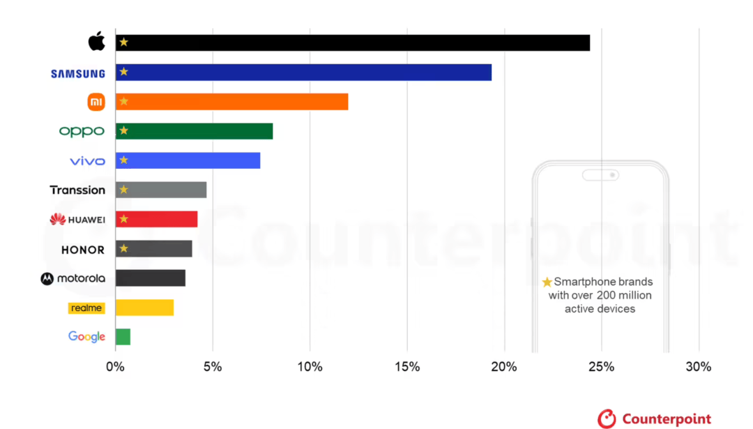目前全球已有八家智能手机厂商的活跃设备存量超过 2 亿台,这八大品牌合计占据了全球超过 80% 的活跃设备份额,呈现出强者愈强的竞争格局。