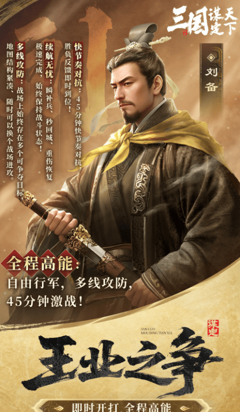 “王业之争”主打快节奏对战的爽快感与深度策略性:对局平均不到一小时,无需漫长等待,局内武将等级、资源通通安排到位,武将补兵加速、重伤快速恢复、秒回城等设置让续航拉满,主公只需专注排兵布阵即可开战。