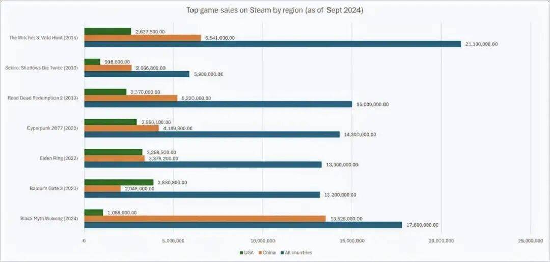 Reddit 上的国外玩家通过 Gamelytic 的销量数据,制作出了一张 Steam 端销量对比表格,上边显示有很多近年热门的 3A 游戏,在中国市场的销量几乎是美国市场的好几倍。